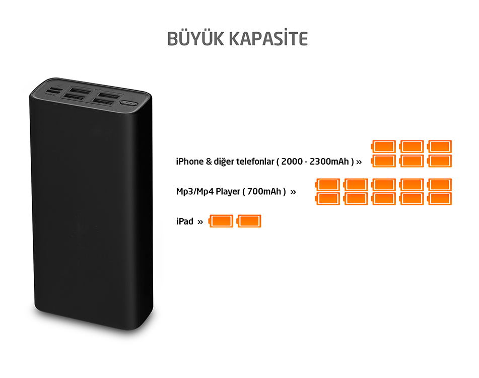Hytech HP-S30PD 30000mAh PD Şarj Powerbank 4 Usb Port Siyah Taşınabilir Pil Şarj Cihazı ; Tam dolu batarya ile iPhone ve diğer mobil telefonlarınızı 6 sefer tam olarak şarj eder. Mp3 & Mp4 oynatıcılarınızı tam dolu batarya ile 12 sefer şarj eder. iPad'inizi ise tam dolu batarya ile 2 sefer şarj edebilir.