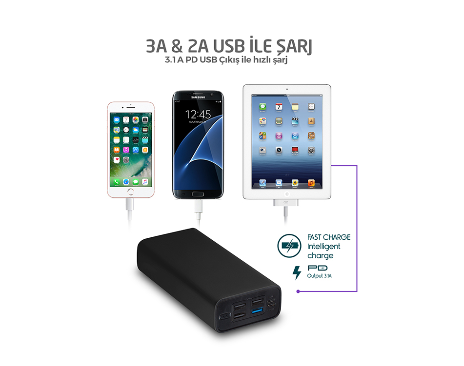 Hytech HP-S30PD 30000mAh PD Şarj Powerbank 4 Usb Port Siyah Taşınabilir Pil Şarj Cihazı ; USB'den şarj olabilen tüm cep telefonları, akıllı telefonlar, Apple ürünleri ( iPod, iPad, iPhone ) tüm tablet PC'ler, ile uyumludur. Rahatlıkla aygıtlarınızı bağlayıp şarj edebilirsiniz.