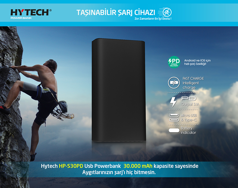 Hytech HP-S30PD 30000mAh PD Şarj Powerbank 4 Usb Port Siyah Taşınabilir Pil Şarj Cihazı ; 30.000mAh Kapasite sayesinde aygıtlarınızın şarj'ı hiç bitmesin. Taşınabilir şarj cihazınızda kullanılmış olan kaliteli Lityum batarya sayesinde içiniz rahat olsun ! Kaliteli materyaller kullanılarak üretilmiş olan sağlam yapısı ve Power Delivery özelliği ile rakiplerinden her zaman bir adım önde. Type C, Lightning ve Micro 5pin ile şarj olabilen tüm cihazlarınıza bağlayıp şarj etme işlemlerinizi gerçekleştirebilirsiniz. Tüm telefonlar ile uyumludur. Telefonlarınızı bağlayarak yüksek kapasitesi ve 3.1A 'lik Qualcomm usb çıkışı ile kolaylıkla şarj etmenin tadını çıkarın ! Mükemmel ve hızlı şarj imkanı tanır.