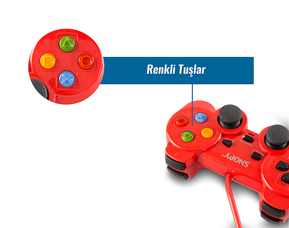 Snopy SG-302 Kırmızı USB 1.8m Kablo Joypad ; Alışılagelmiş oyun tutuşu için sağ eliniz ile kolayca erişebileceğiniz noktada 4 adet aksiyon tuşu bulunmaktadır. Birbirindenbağımsız yapıda, kusursuz tepkime veren, kaliteli ateş tuşları ile attığınızı tam zamanında vuracak, hiç bir şutu kaçırmayacaksınız! Diğer gamepadlerden farklı olarak tasarlanmıştır.
